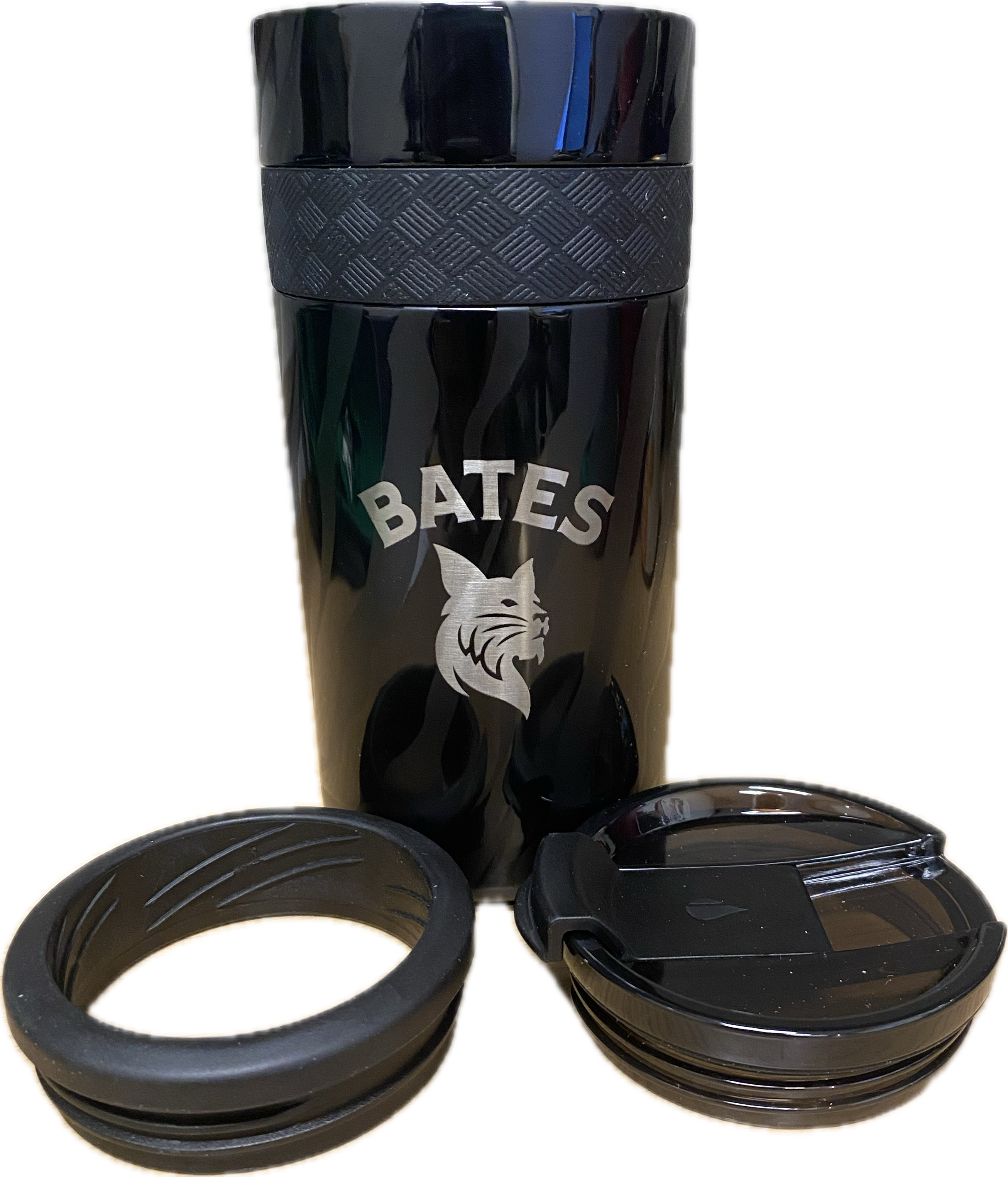 Gloss black with etched BATES arched over Bobcat icon