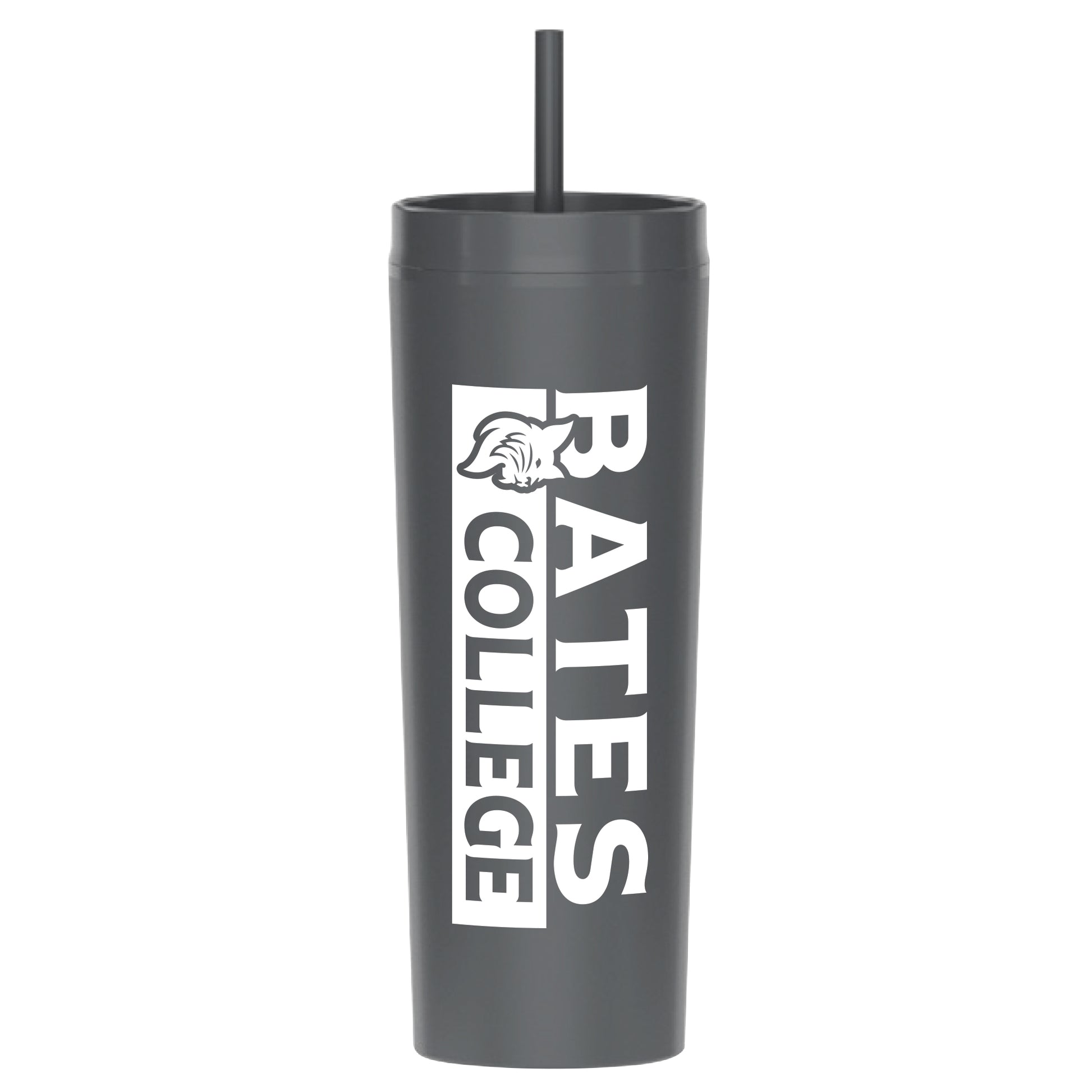 17 oz. double-wall acrylic tumbler with matching threaded lid, matching soft straw and rubberized outer finish.