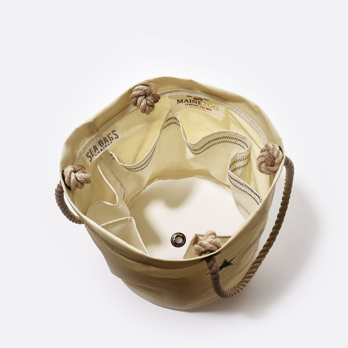 Maine's 1901 state flag is not only historic, but full of maritime meaning. The North Star has long been a navigation tool for sailors and the pine tree made our state's unique flag recognizable from great distances. Even the flag's background color had meaning, it was meant to resemble the buff color of George Washington's 1779 Continental Army uniforms. The Maine Bicentennial Beverage Bucket Bag includes antique brass hardware, an engraved Sea Bags brass bottle opener, and the Maine Bicentennial logo tag. Fill the center with ice and you've got a collapsible cooler showcasing your Vacationland pride. Melting ice then escapes through the brass grommet hole in the base of the water-resistant recycled sail cloth.