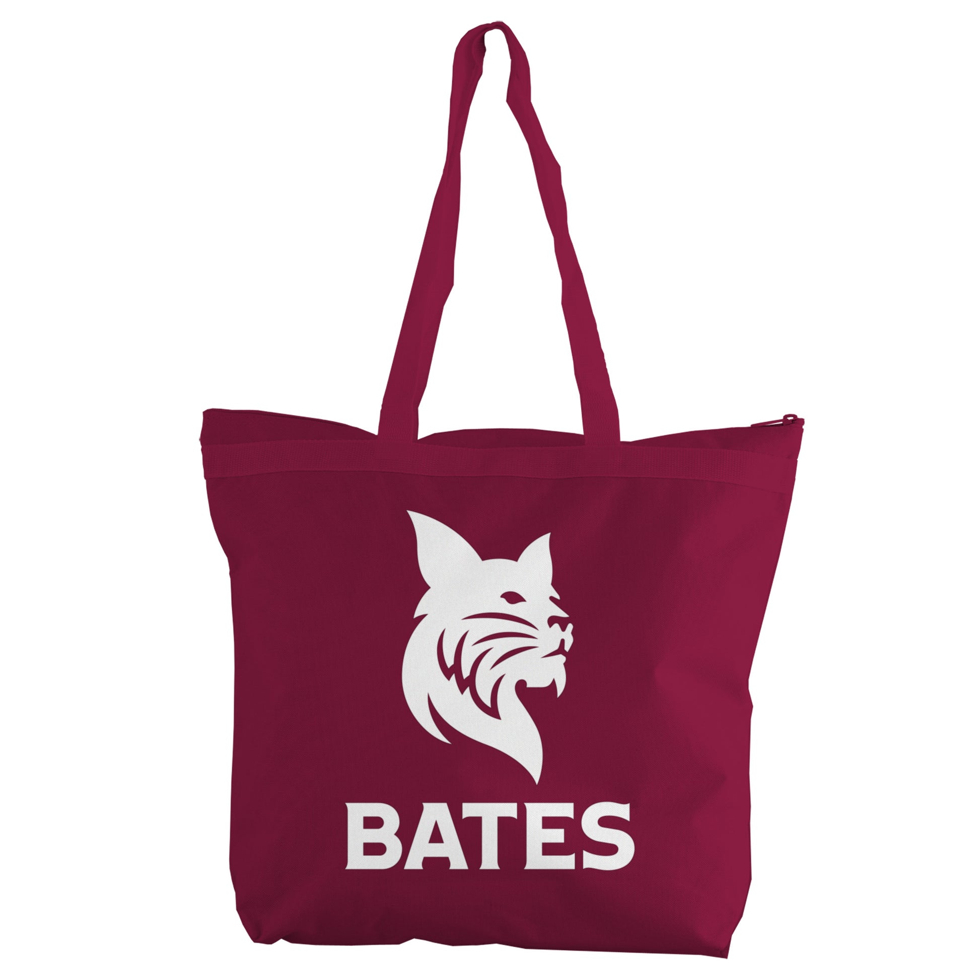 Show your Bates pride wherever you go with this classic Bates College tote bag. Designed in a rich maroon color, it features the iconic white Bobcat logo and bold BATES wordmark for a clean, collegiate look. Made from durable fabric, this tote offers a spacious main compartment with a secure zip-top closure, perfect for carrying books, groceries, gym gear, or daily essentials. Comfortable shoulder-length handles make it easy to carry on campus or around town. A practical and stylish accessory for students, alumni, and Bates fans alike.